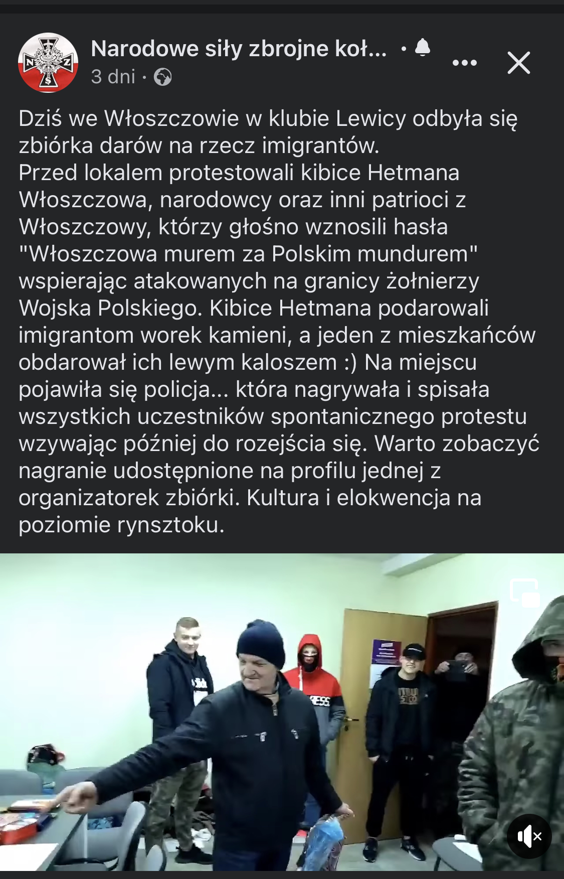 Przed lokalem protestowali kibice Hetmana Włoszczowa, narodowcy oraz inni patrioci z Włoszczowy, którzy głośno wznosili hasła "Włoszczowa murem za Polskim mundurem" wspierając atakowanych na granicy żołnierzy Wojska Polskiego. Kibice Hetmana podarowali imigrantom worek kamieni, a jeden z mieszkańców obdarował ich lewym kaloszem 🙂 Na miejscu pojawiła się policja… która nagrywała i spisała wszystkich uczestników spontanicznego protestu wzywając później do rozejścia się. Warto zobaczyć nagranie udostępnione na profilu jednej z organizatorek zbiórki. Kultura i elokwencja na poziomie rynsztoku.