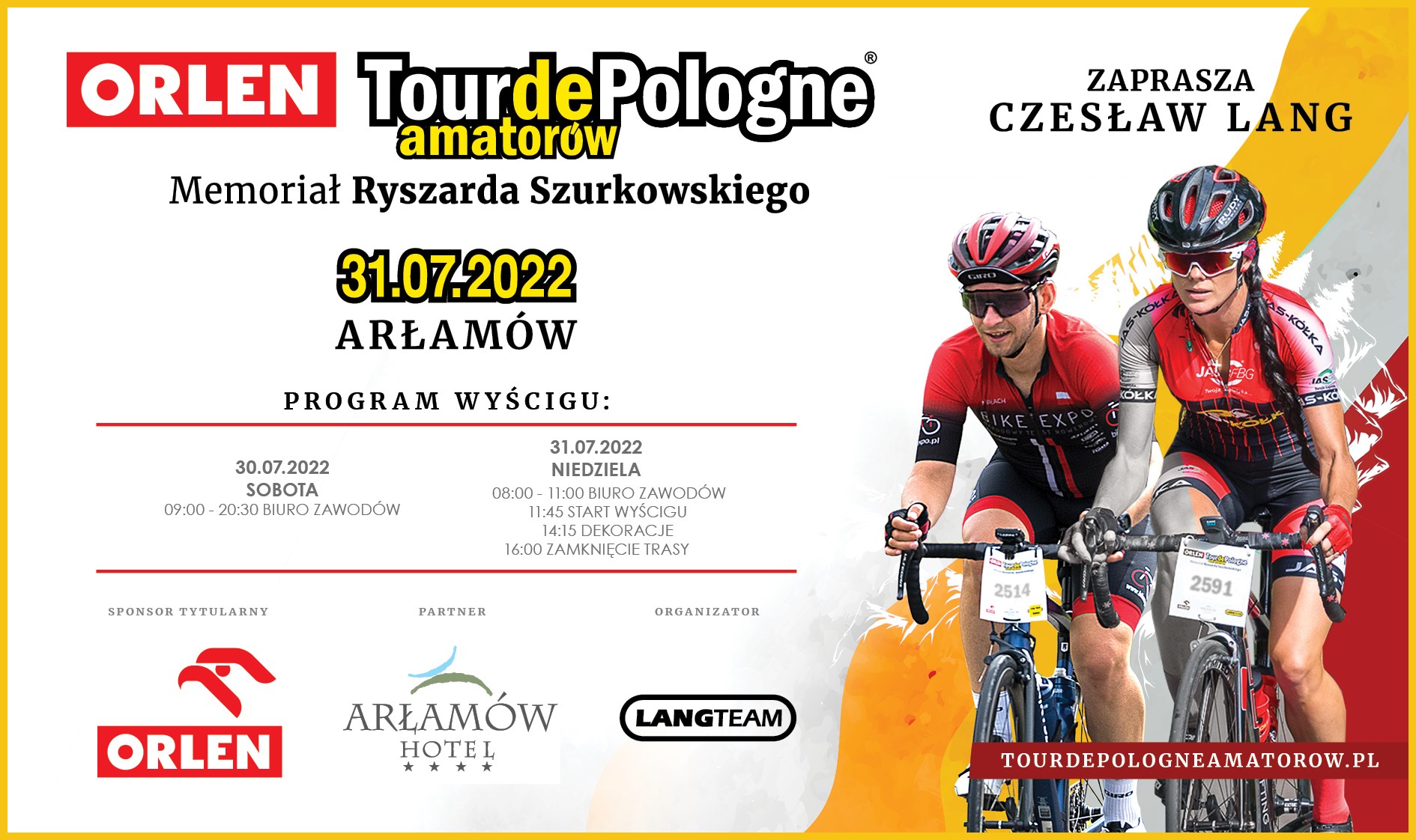 ­- W tym roku stawiamy na sprawdzone miejsce i ponownie zapraszamy wszystkich amatorów do Arłamowa. Przygotowaliśmy piękną, wymagającą, ale bezpieczną trasę w Bieszczadach. Do pokonania będzie 75 kilometrów ze startem i metą w Hotelu Arłamów. Będzie to szansa aby przejechać odcinkiem III etapu dla zawodowców z Kraśnika do Przemyśla. Najlepsza zawodniczka i zawodnik wygrają wyjazd do Madonna di Campiglio. – zapowiada Czesław Lang i dodaje – ale mam jeszcze jednego asa w rękawie i wkrótce zdradzimy więcej szczegółów o dodatkowej nagrodzie dla najszybszych na podjeździe pod Kalwarię Pacławską. – dodaje wicemistrz olimpijski.