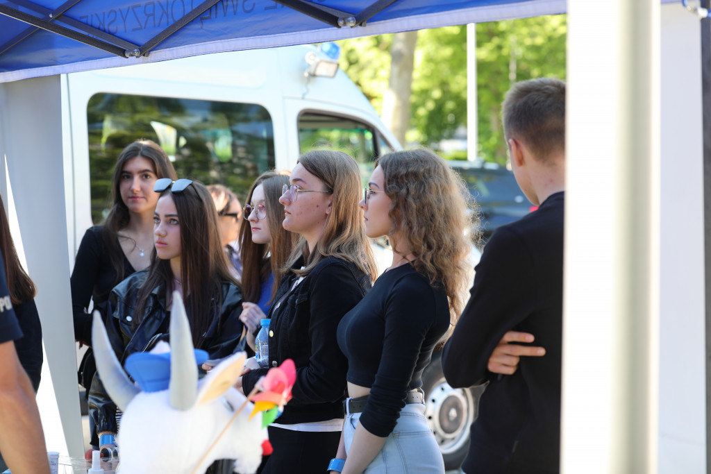 Każdy chętny, na stoisku przygotowanym przez świętokrzyskich policjantów, mógł sprawdzić na specjalnych symulatorach, jak świat rozpoznaje nasz mózg pozostający pod wpływem substancji odurzających, niektórych leków czy też alkoholu. Służyły do tego alkogogle i narkogogle. Interesujący był także nietypowy pojazd, w którym można było przekonać się, jak ważne są pasy bezpieczeństwa.