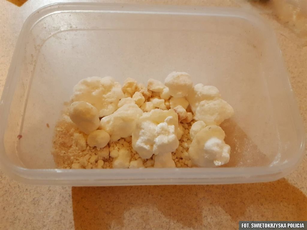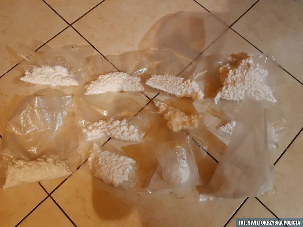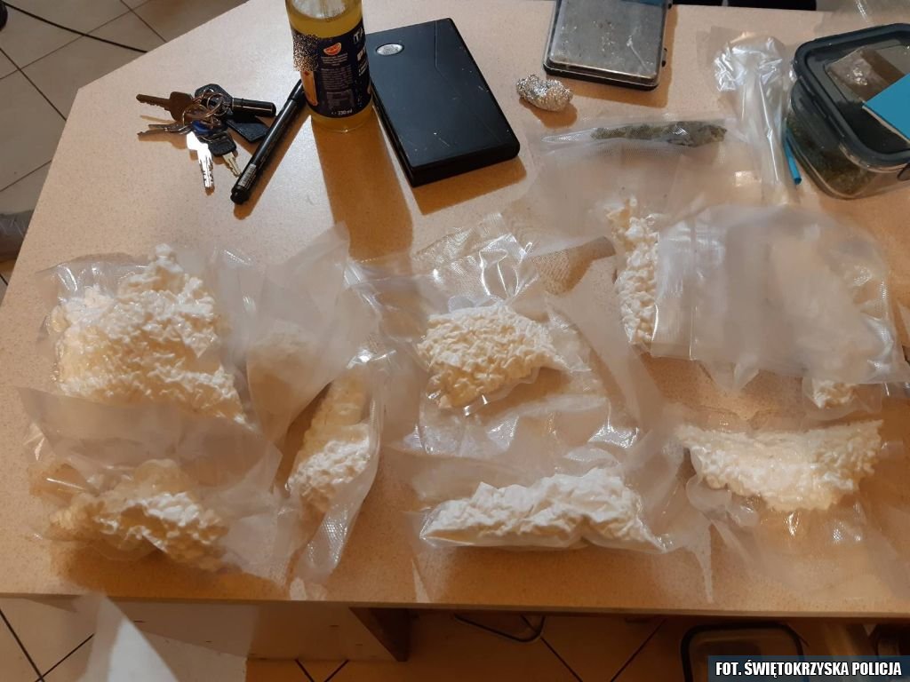 „W trakcie przeszukania mundurowi w kilkunastu miejscach znaleźli łącznie ponad dwa kilogramy białej substancji, zidentyfikowanej jako amfetamina oraz ponad półtora kilograma roślinnego suszu wstępnie określonego jako marihuana. Nielegalne specyfiki zostały zabezpieczone i trafiły do kryminalistycznego laboratorium” – poinformował w poniedziałek podkomisarz Damian Janus, oficer prasowy Komendy Wojewódzkiej Policji w Kielcach.