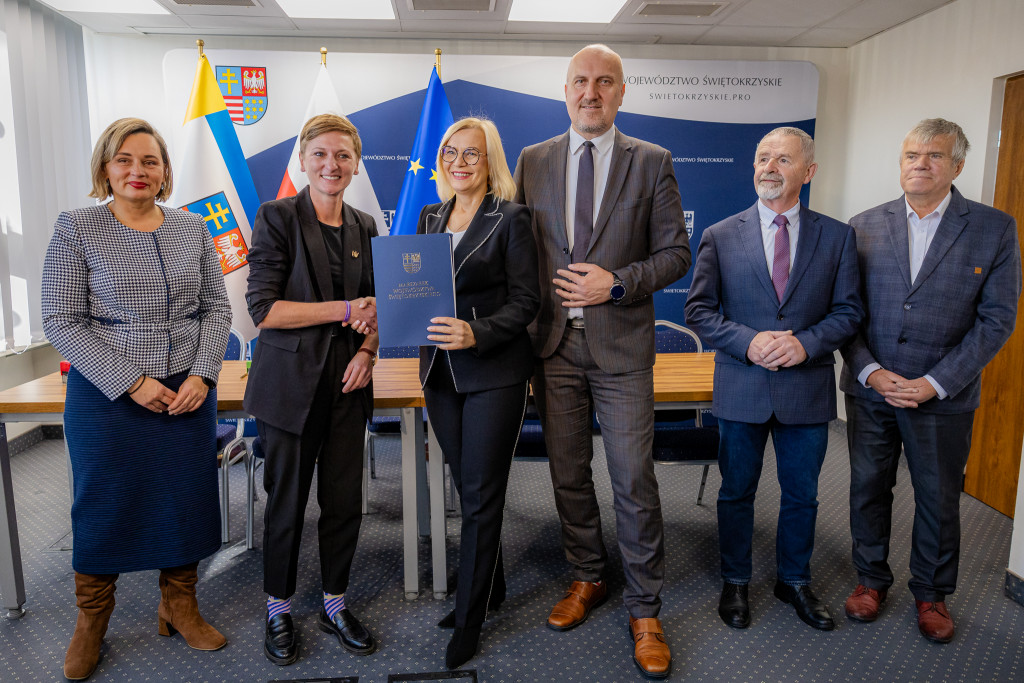Marszałek województwa Renata Janik i wicemarszałek Grzegorz Socha podpisali z prezydent Kielc Agatą Wojdą umowę na dofinansowanie realizacji jednej z największych inwestycji, związanych z rozwojem biznesu w regionie – budową Inkubatora California w Kielcach w ramach rozbudowy infrastruktury i oferty Kieleckiego Parku Technologicznego. Przedsięwzięcie otrzyma ponad 62 mln zł wsparcia z programu Fundusze Europejskie dla Świętokrzyskiego 2021–2027. W spotkaniu wzięli udział wiceprzewodniczący Sejmiku Województwa Świętokrzyskiego Mieczysław Gębski i radny Sejmiku Kazimierz Mądzik.